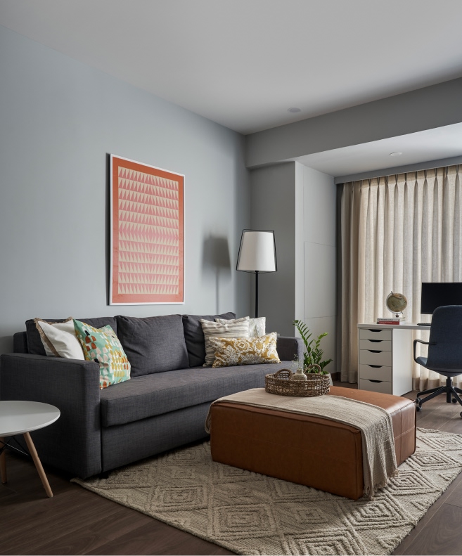 A medley of soft-toned hues traversing greys and blues sets the tone in the intimate spaces — an extension of the neutrality that flows uninterruptedly through the home. The residence’s reprised layout was thoughtfully designed to create distinct kitchen, living, and dining zones while fostering an openness that wasn’t a feature in the former blueprint.