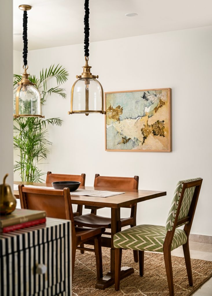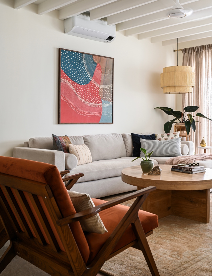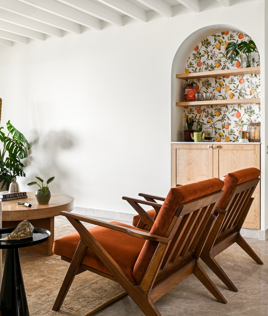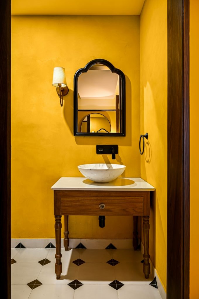 The living area is overruled by the reign of neutrals, with greys and browns setting a timeless canvas for colour to debut with restraint as installations and soft furnishings. A rendezvous with earthy greens unfolds in the open-plan kitchen, with sage hues singing against the ochre floor tiles. Rustic modernism claims the spotlight in the secondary living space, with furniture that gracefully travels shifting periods and styles.
