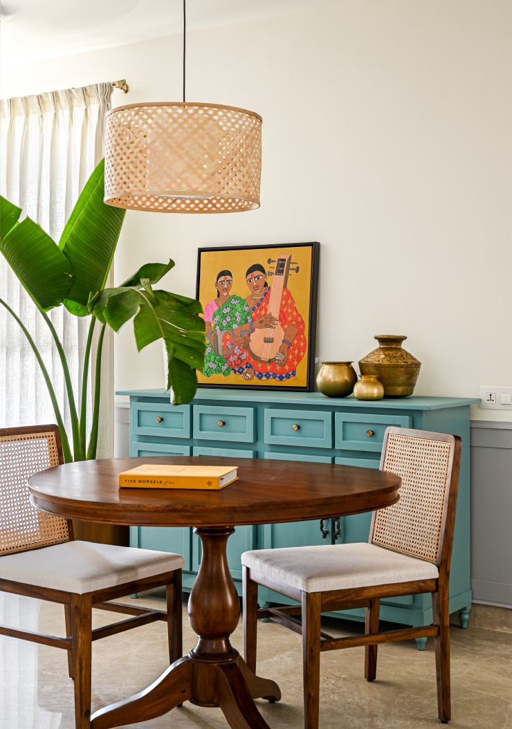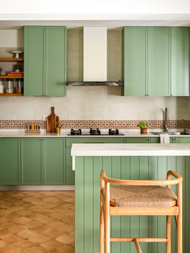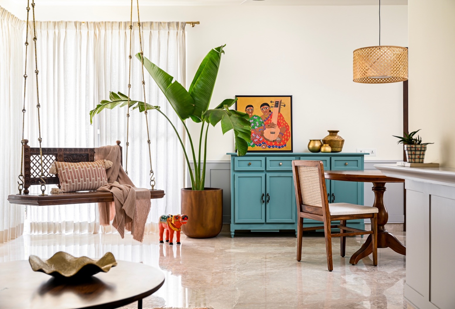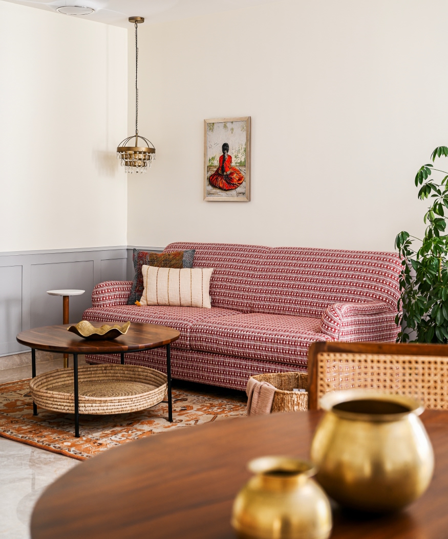 The living area is overruled by the reign of neutrals, with greys and browns setting a timeless canvas for colour to debut with restraint as installations and soft furnishings. A rendezvous with earthy greens unfolds in the open-plan kitchen, with sage hues singing against the ochre floor tiles. Rustic modernism claims the spotlight in the secondary living space, with furniture that gracefully travels shifting periods and styles.
