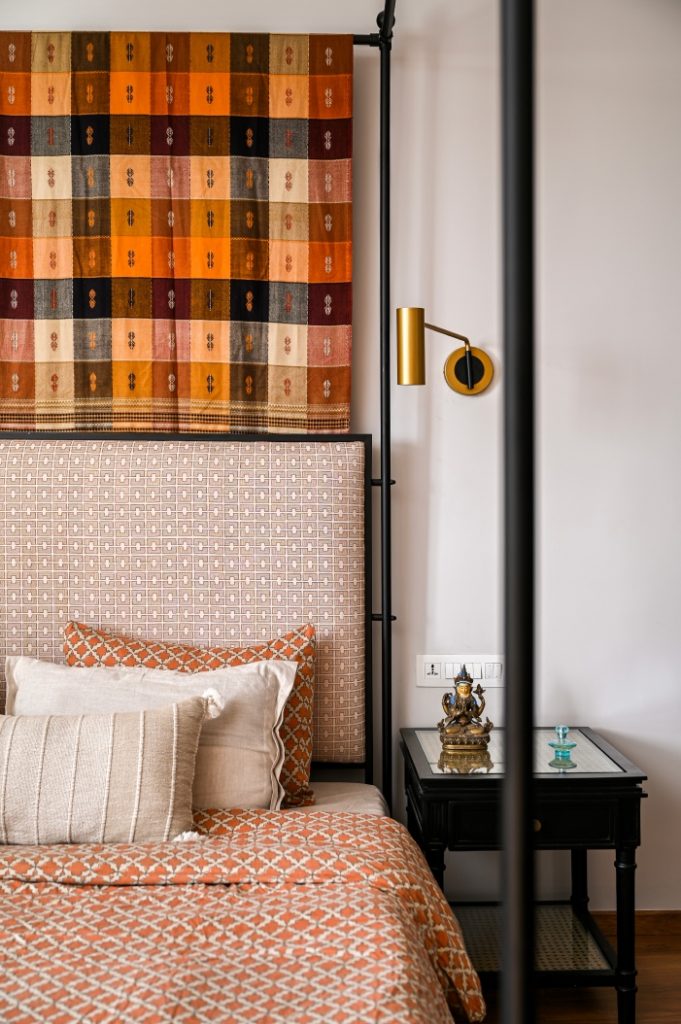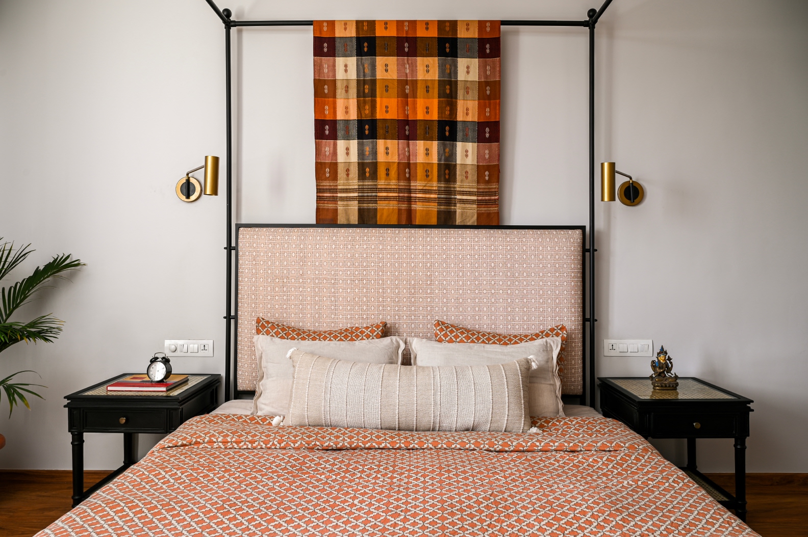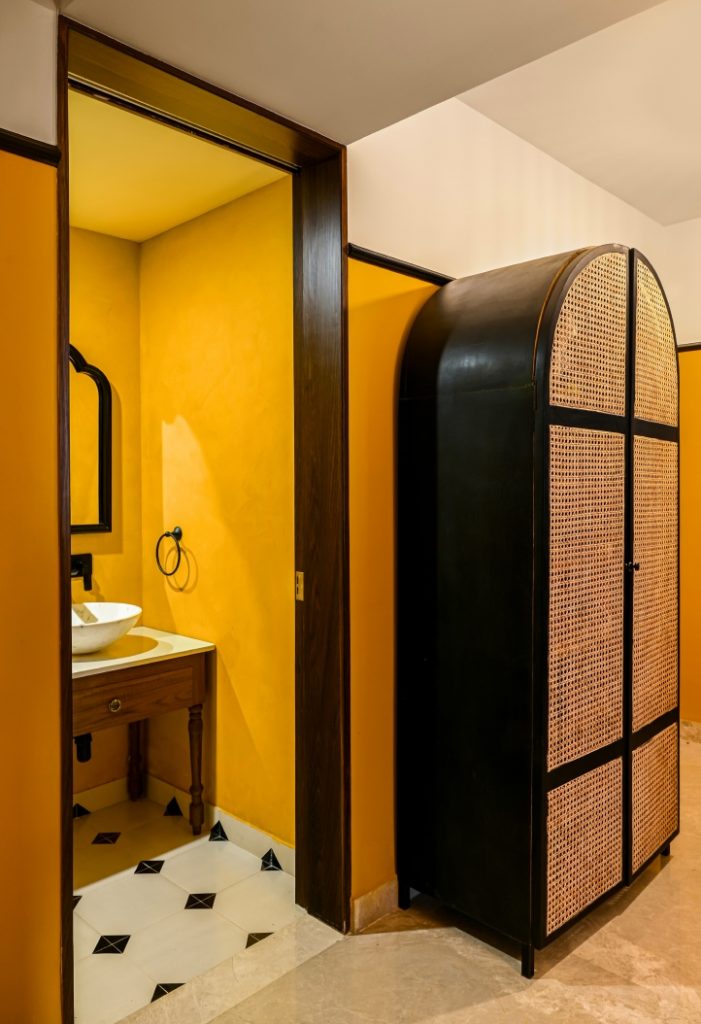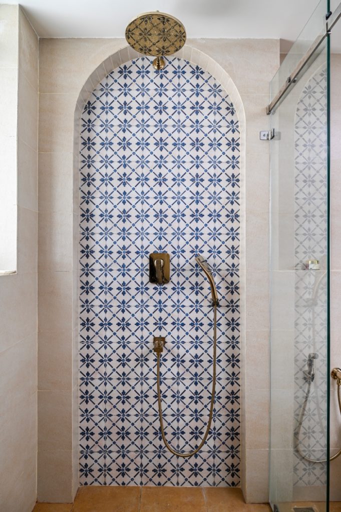 The primary bedroom has a sleek metal canopy bed, with an heirloom shawl masquerading as an installation above. Two bathrooms were merged to form a spacious bath and walk-in wardrobe. Rich teak, crisp whites, deep blues, and an arch-tiled shower wall define the bathroom’s refined palette.
