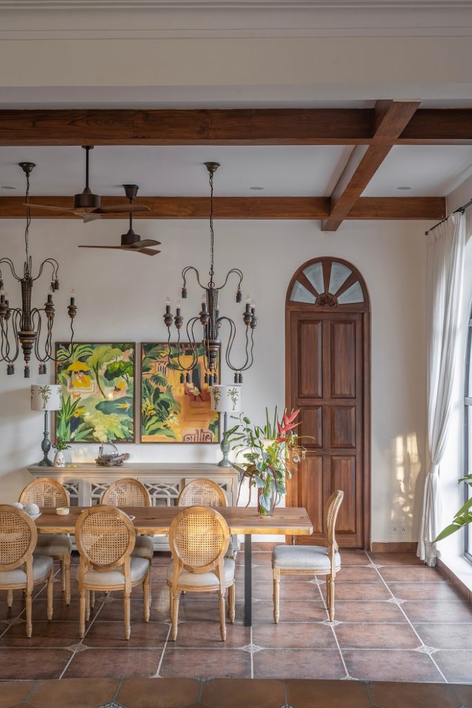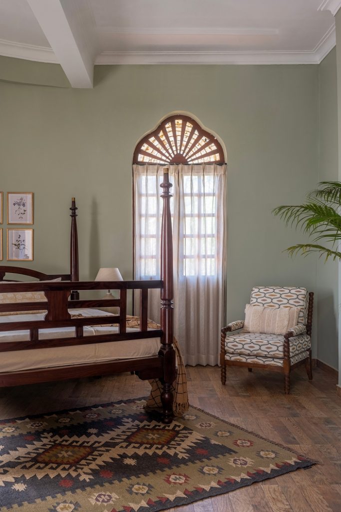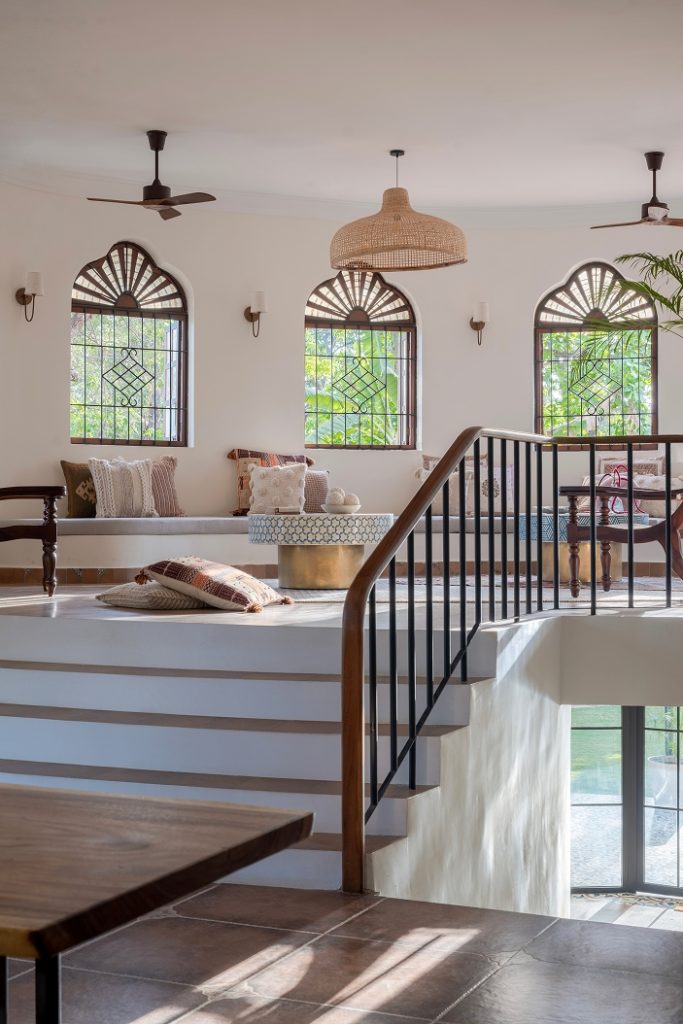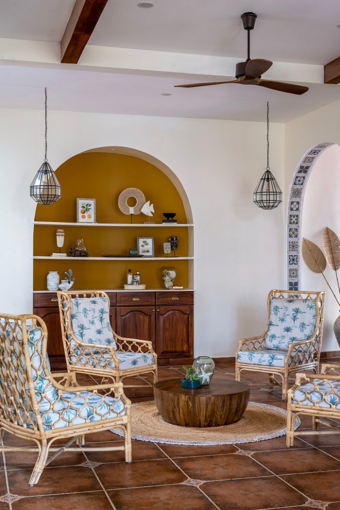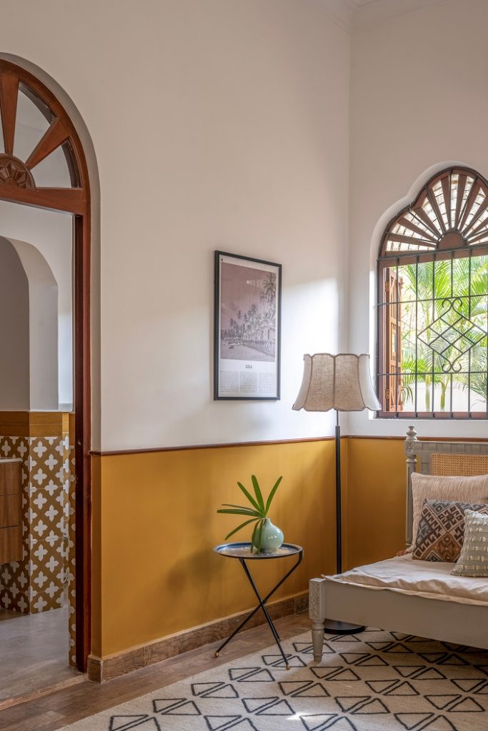The doors open into a large living area exhibiting a reworked layout. Here, indigo, ochre, and umber tones coalesce seamlessly, painting an image of the sea and sand — a love letter to the land of Goa. The elevated lounge overlooks the verdant landscape through the archetypal, Portuguese-style windows. While the dining area is straight out of a vintage Goan painting, its interplay of wood, cane, and metal evokes a milieu from an era bygone. Within the pitched roof’s soaring volumes, the bedrooms embody repose, their curation intentional and playful in its ode to Goa.