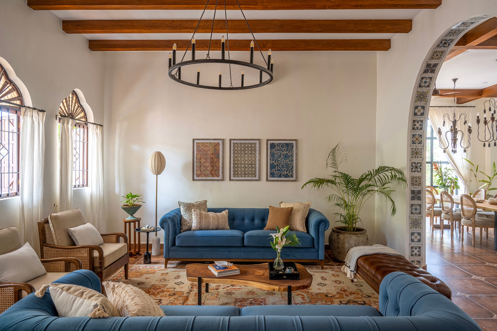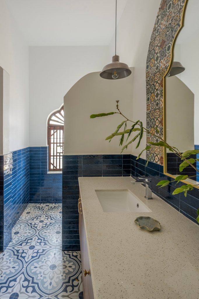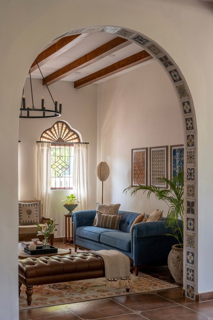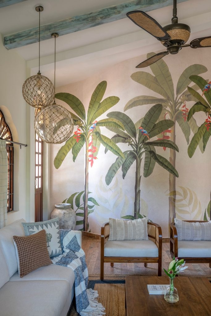 The doors open into a large living area exhibiting a reworked layout. Here, indigo, ochre, and umber tones coalesce seamlessly, painting an image of the sea and sand — a love letter to the land of Goa. The elevated lounge overlooks the verdant landscape through the archetypal, Portuguese-style windows. While the dining area is straight out of a vintage Goan painting, its interplay of wood, cane, and metal evokes a milieu from an era bygone. Within the pitched roof’s soaring volumes, the bedrooms embody repose, their curation intentional and playful in its ode to Goa.