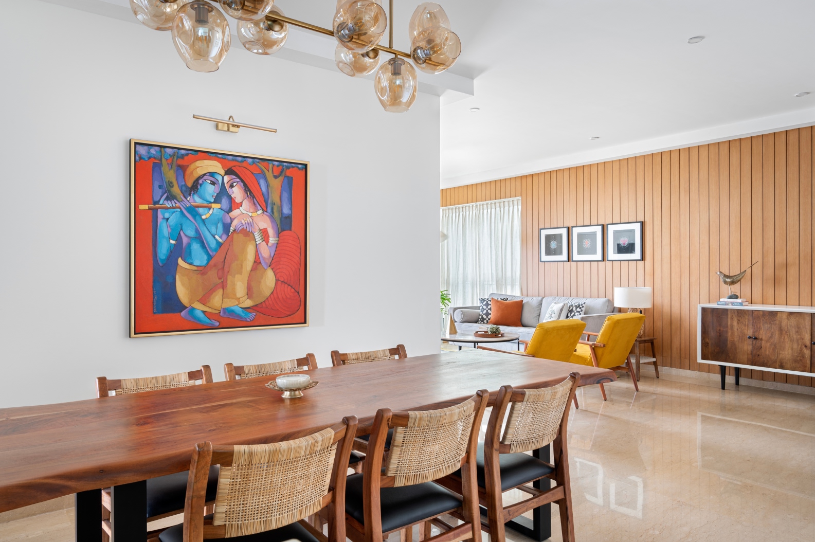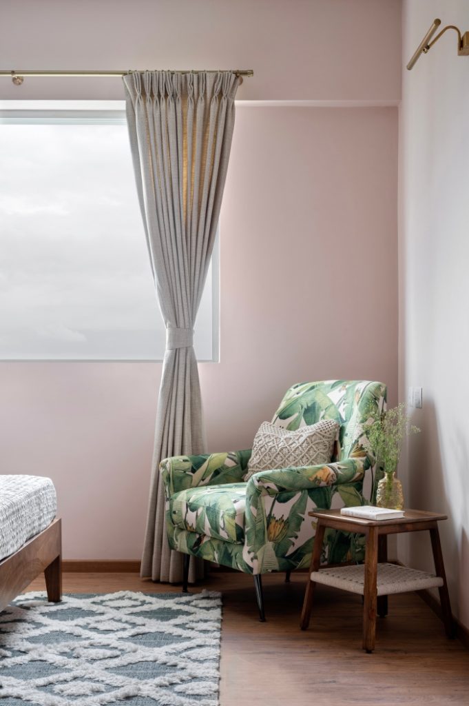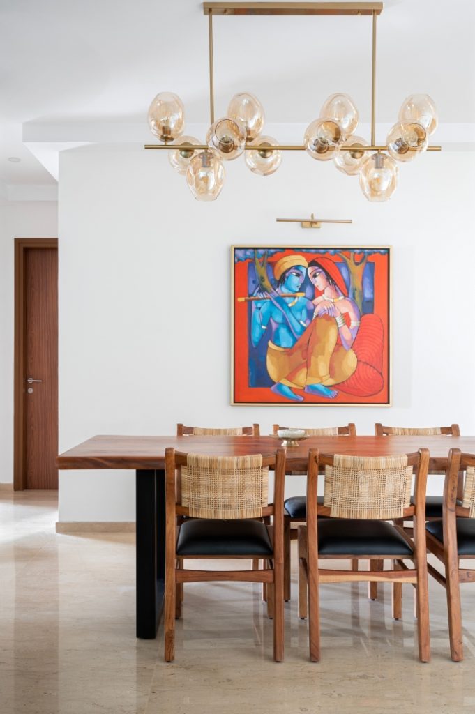 The hearty blueprint integrates the living and dining zones, its periphery enwrapped by a balcony which frames the context’s greenery-steeped views. In the living space, the syzygy between ochre, dove grey, playful geometrics and focal art creates an inviting milieu. The sun-soaked dining area is grounded by a striking Radha-Krishna painting, its saturated colour palette balanced against the neutrals of the Mid-Century Modern furniture ensemble.