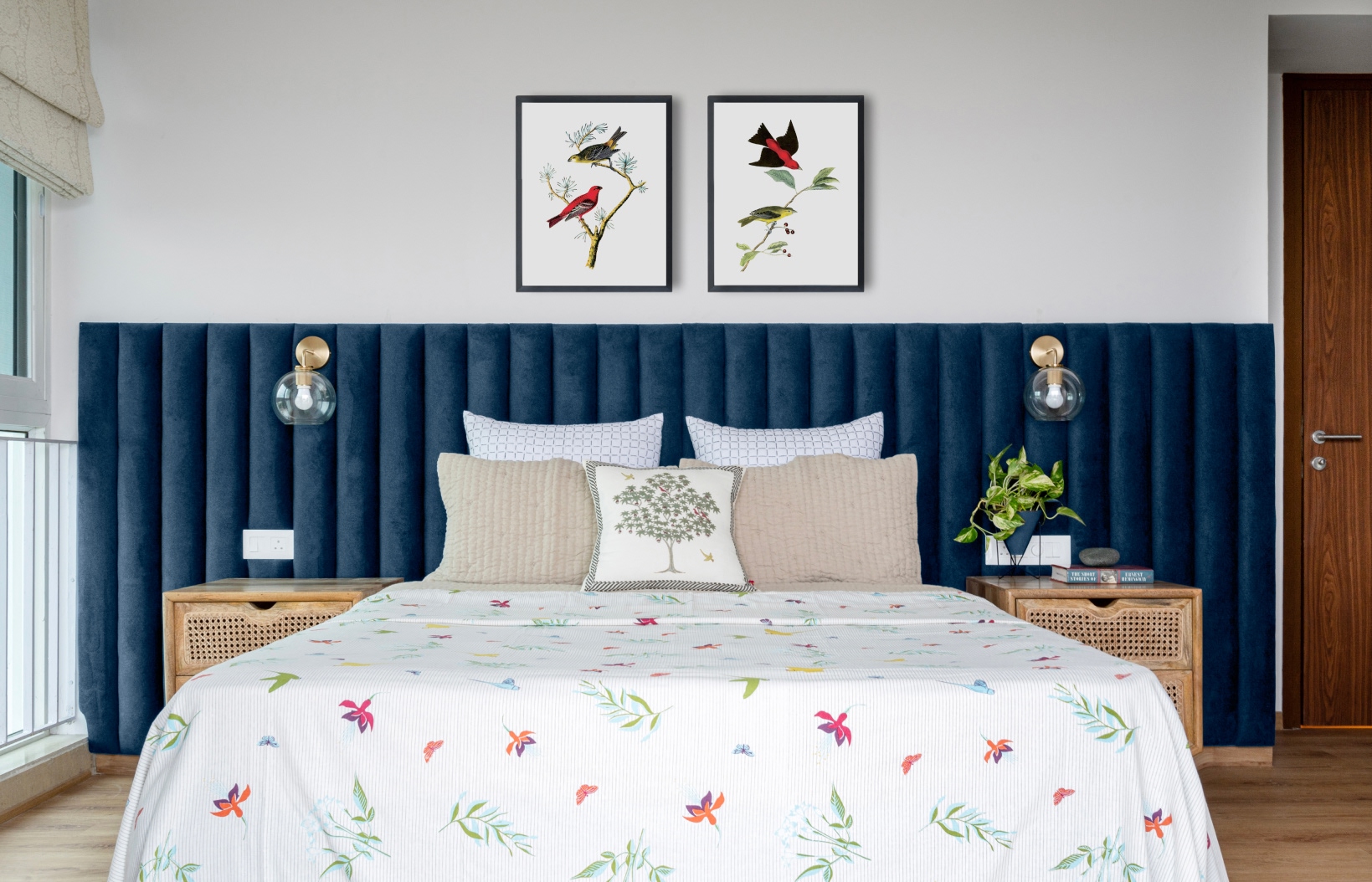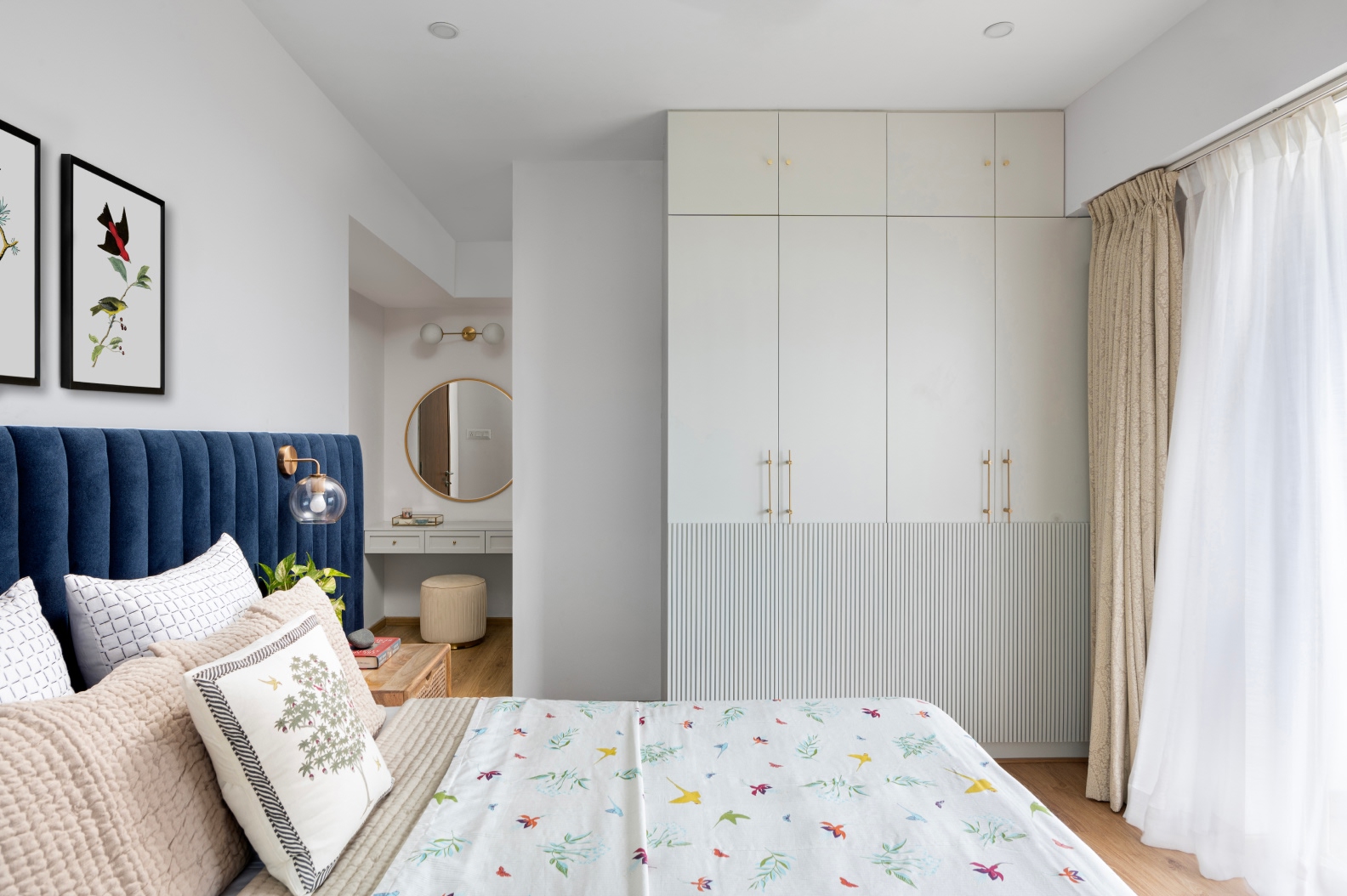Relishing the site’s immediate context, the master suite invites nature-inspired imagery indoors, the chic avian influences juxtaposed against the deep sapphire tufted headboard. In the bedrooms, a muted pastel palette claims the spaces with debuts of natural materiality and tropical homages trickling into design elements.