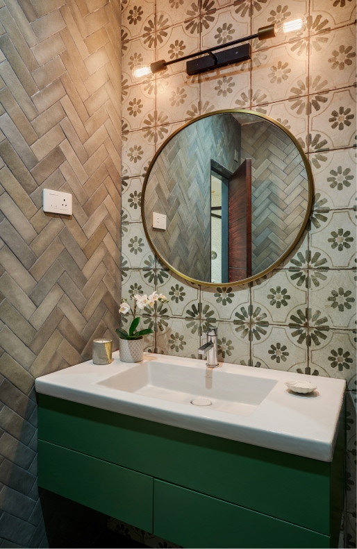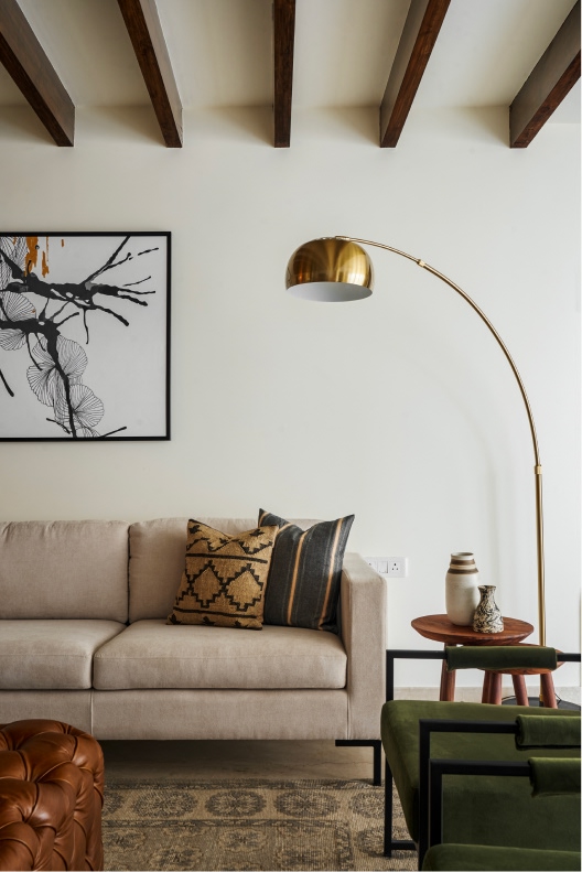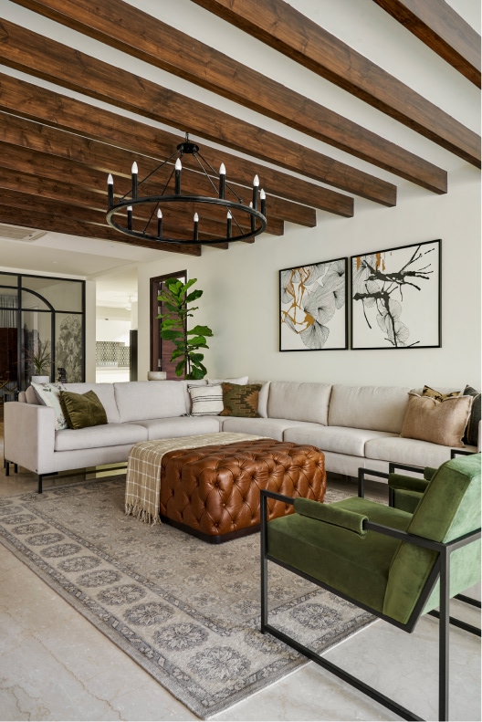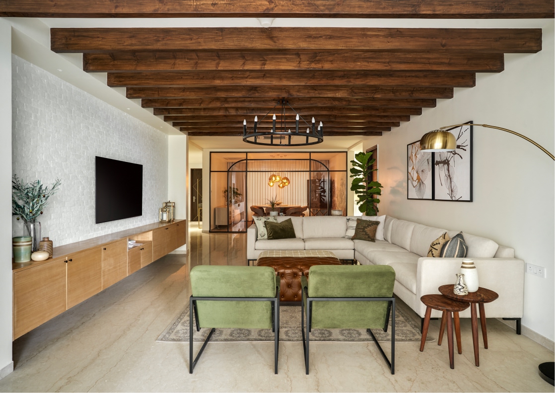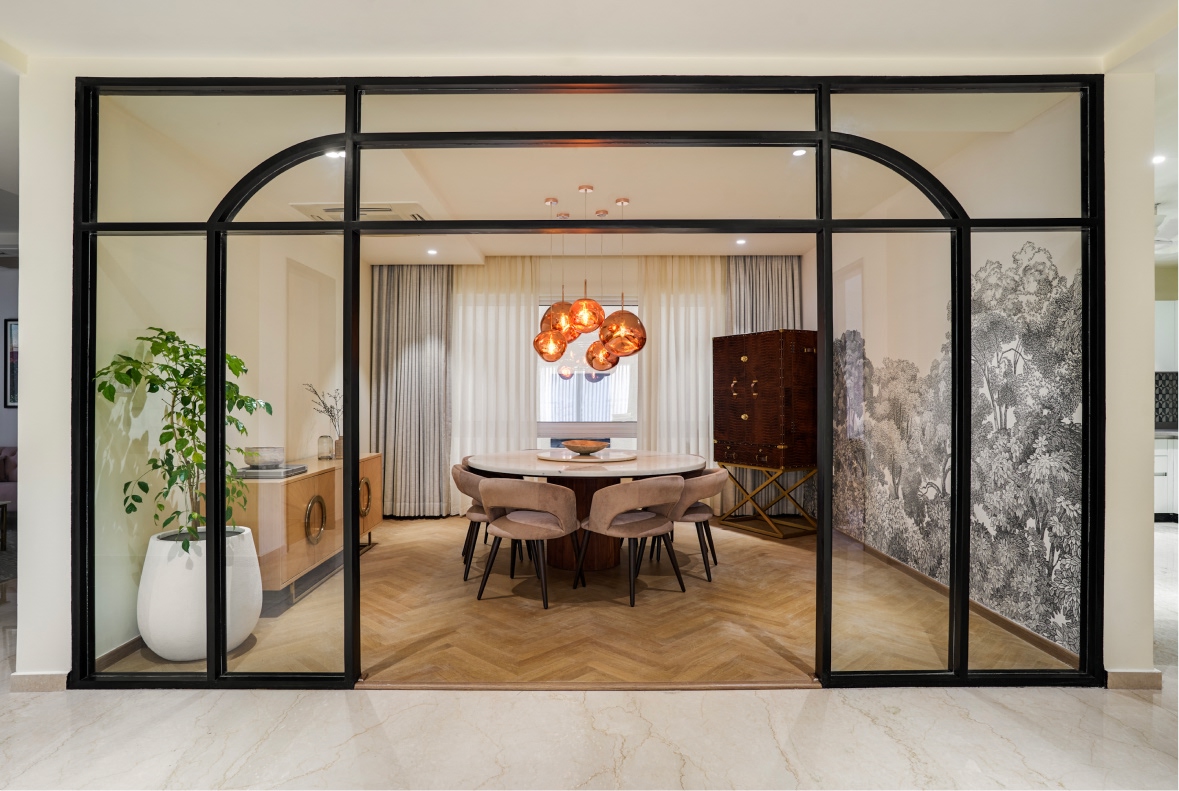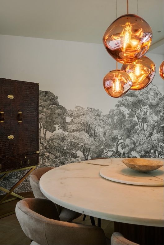 The formal living space comprises blush velvet sofas informing the bijou room’s layout, alongside a marble coffee table and ochre ottomans. A 12-foot custom sofa, olive chairs, and a tufted leather ottoman formulate the informal living area’s blueprint. Lime-washed white brick walls, an array of wood beams, and a black chandelier add textural depth while the balcony ushers in light. Held within the membrane of a glass-metal partition system, the monochrome landscape mural, bar cabinet, and round marble table whip up an intimate milieu in the dining room.