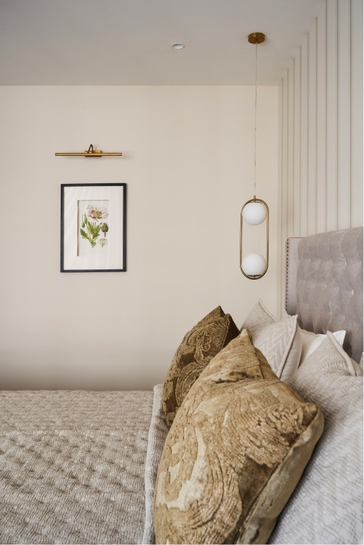 In the resting spaces, colour plays second fiddle to the sovereignty of neutrals, the former featuring as mindful accents. A velvet bed set against a striped wallpaper is complemented by a burgundy daybed and a cane-front console, creating a layered master suite.