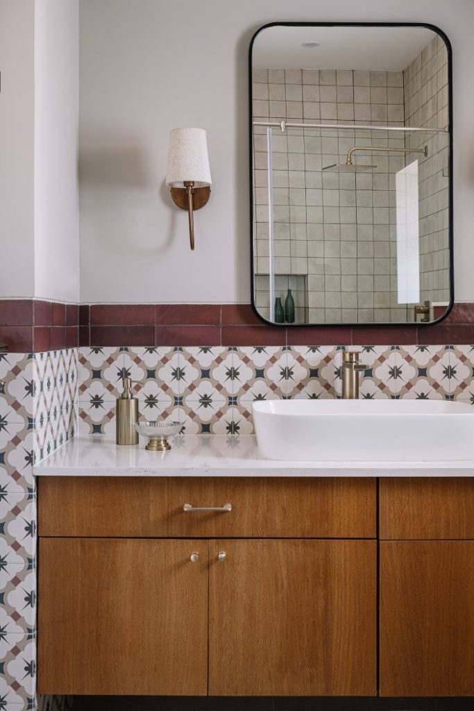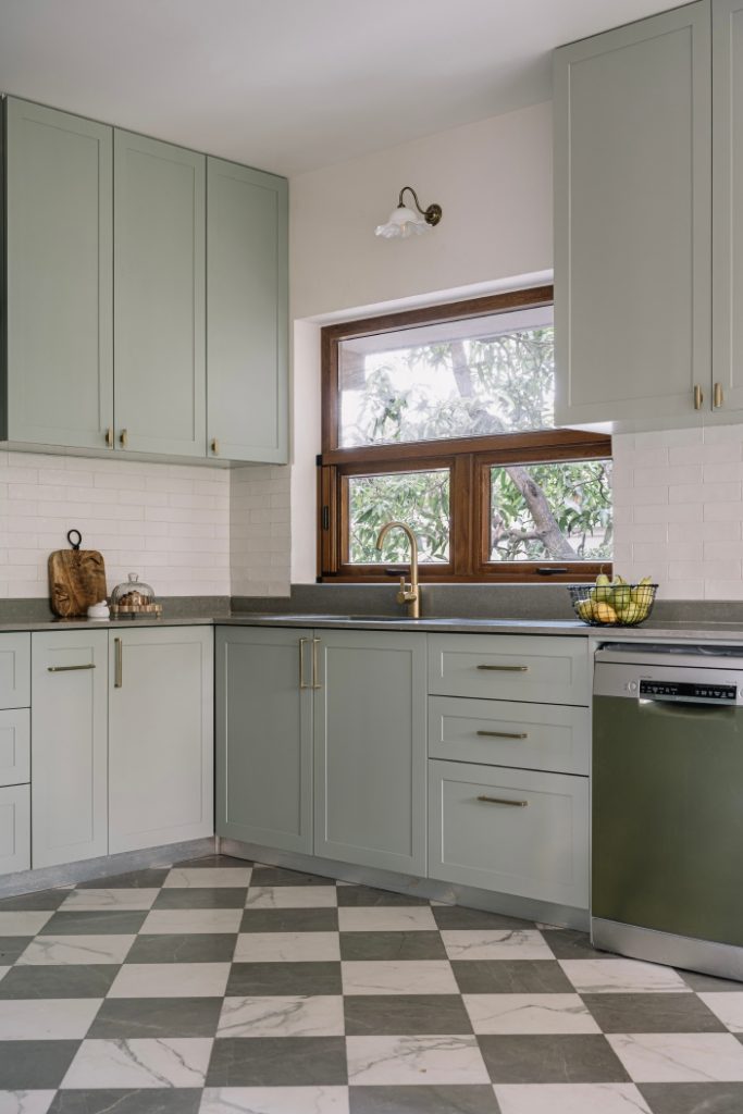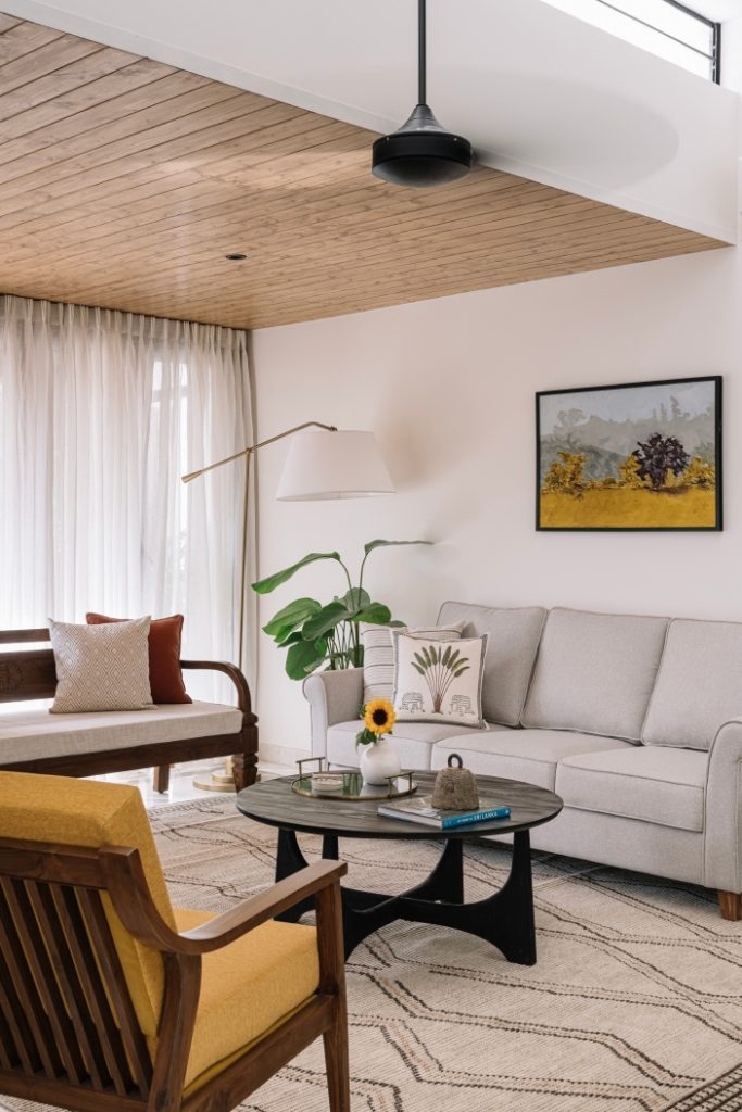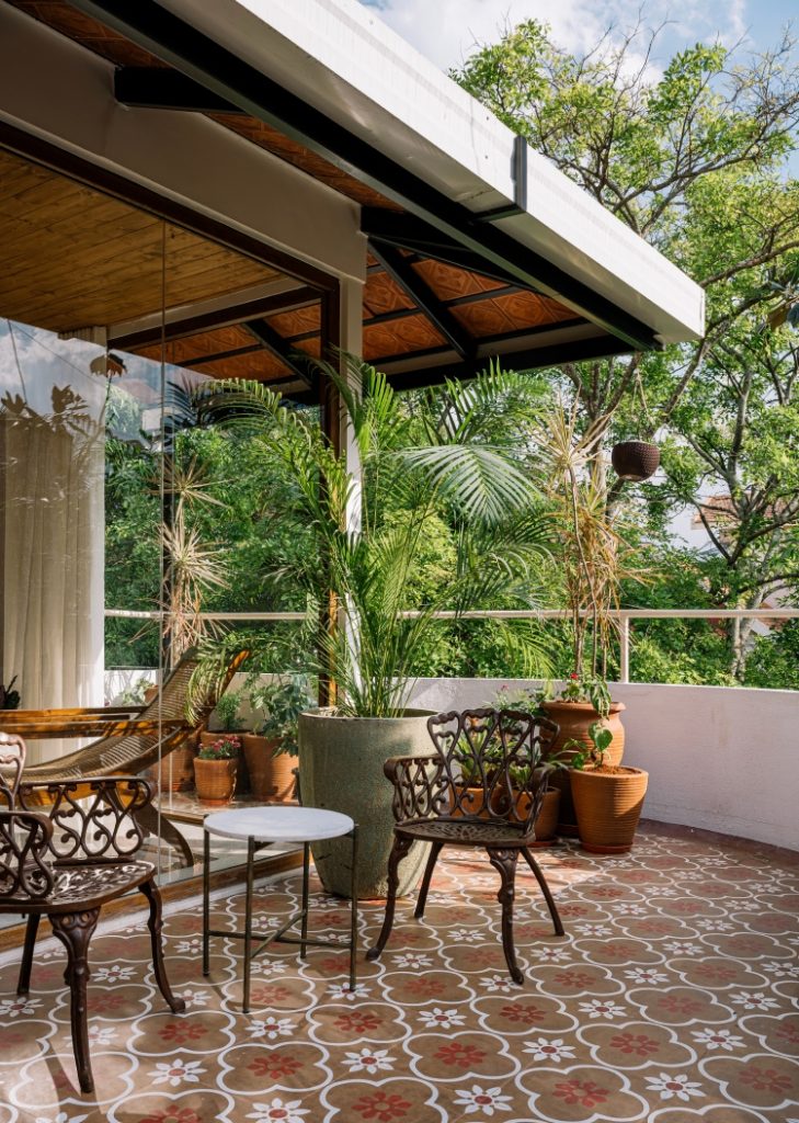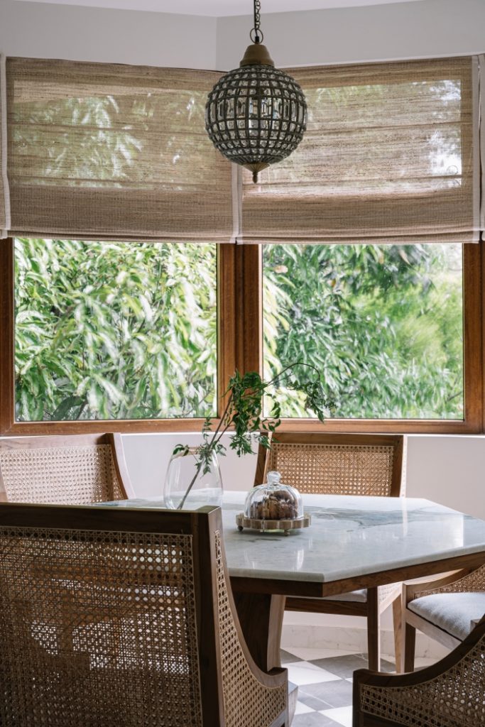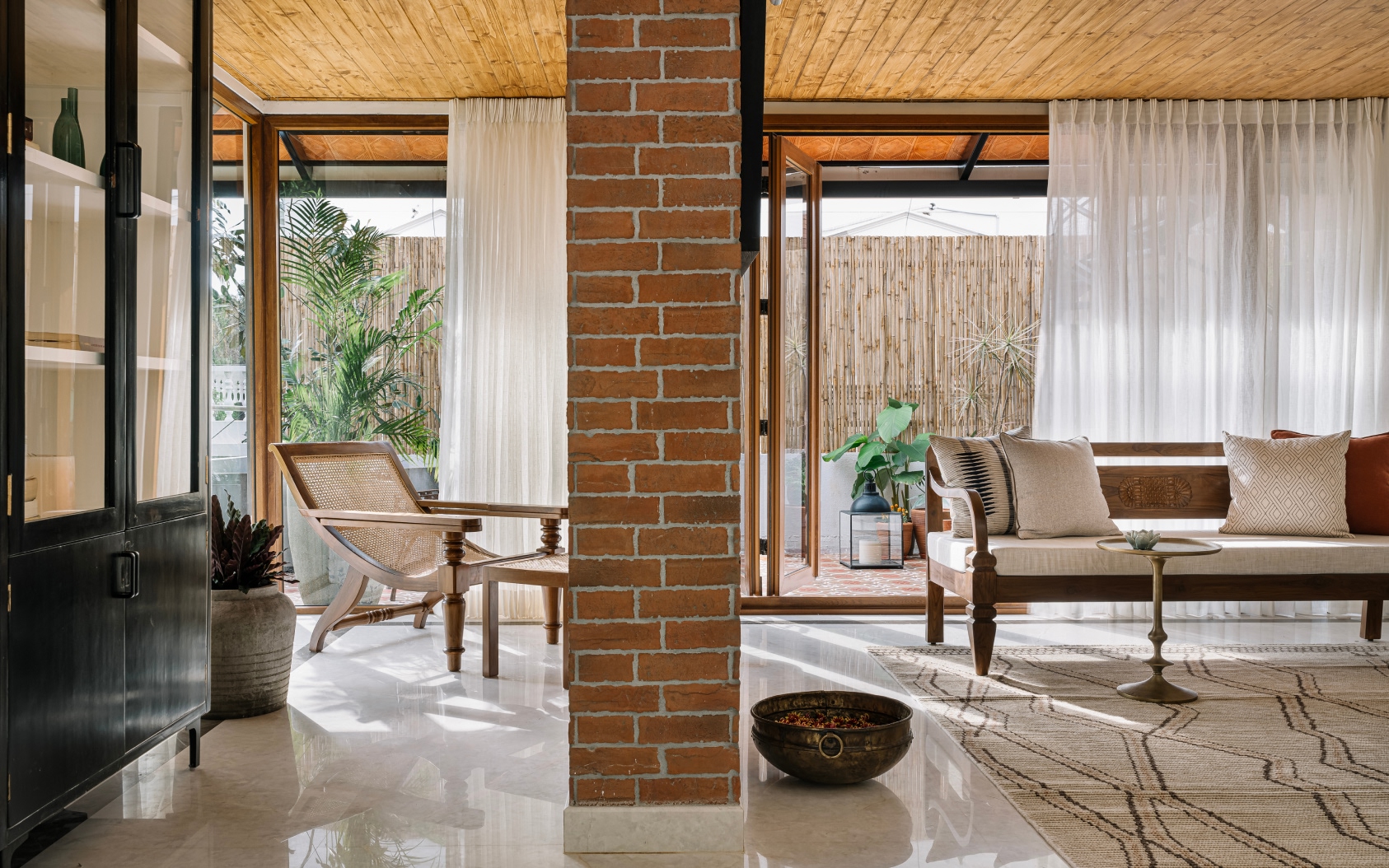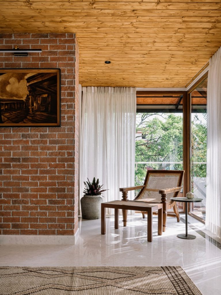 Combining materials such as marble, wood, and natural stones, complemented by the thoughtful use of colour and pattern, achieves a harmonious visual appeal. A red brick-clad wall, wood-lined ceilings, and expansive fenestrations enveloping the space lend the living experience a cottage-esque milieu. At the same time, a pattern-speckled verandah enwraps the home’s periphery.