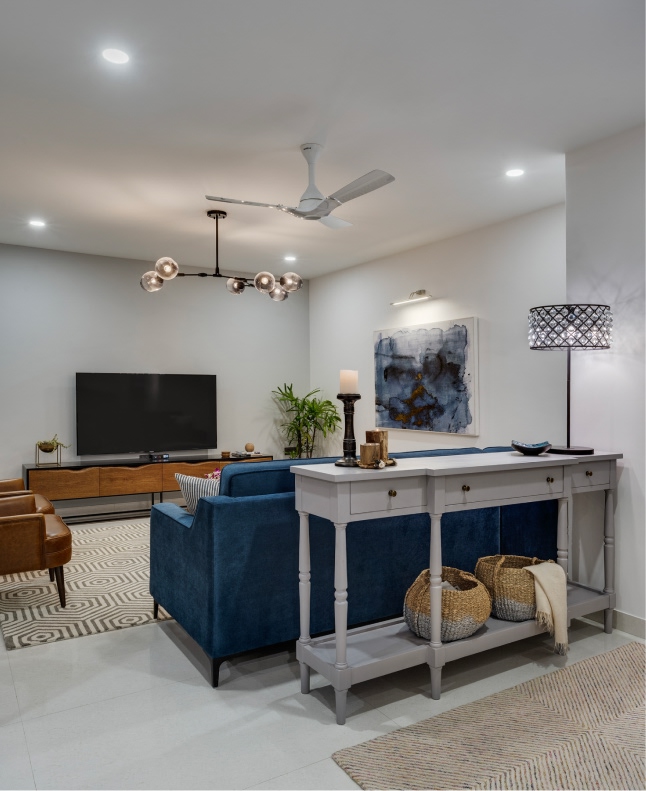 A former structural restraint, the column in the open living-dining space’s centre, masquerades as a spatial demarcator, splicing the layout intentionally. A roomy navy sectional, tan armchairs, and bold wood accents concoct the living space’s identity. The farmhouse-style-inspired dining area is designed with a wood table and black Windsor chairs, blending rustic and modern nuances deftly. Celebrating mustard, greys, and navy, the lounge is a sun-soaked perch. The generously sized kitchen explores the timeless pairing of deep blues and white, highlighting the home’s Mediterranean inspiration.