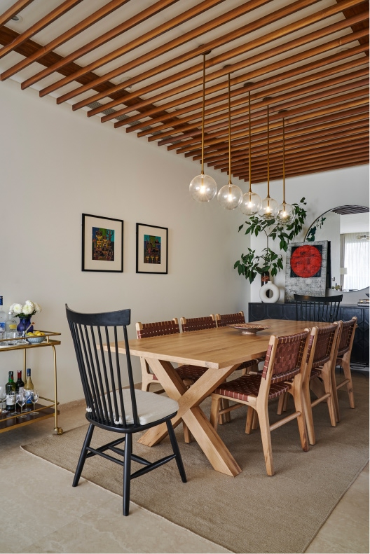 Neutral tones, wood, rattan, and eclectic art pepper the space ubiquitously, creating an earthy shell replete with character. The living’s all-white embrace is punctuated with timeless pieces of modern furniture, focal art, and sculptural greens. A dramatic, pergola-style dining area is reminiscent of breezy beach shacks, and its furniture is a crossover between farmhouse and modernist-style pieces. The bright kitchen was reconfigured to house a large, central island.