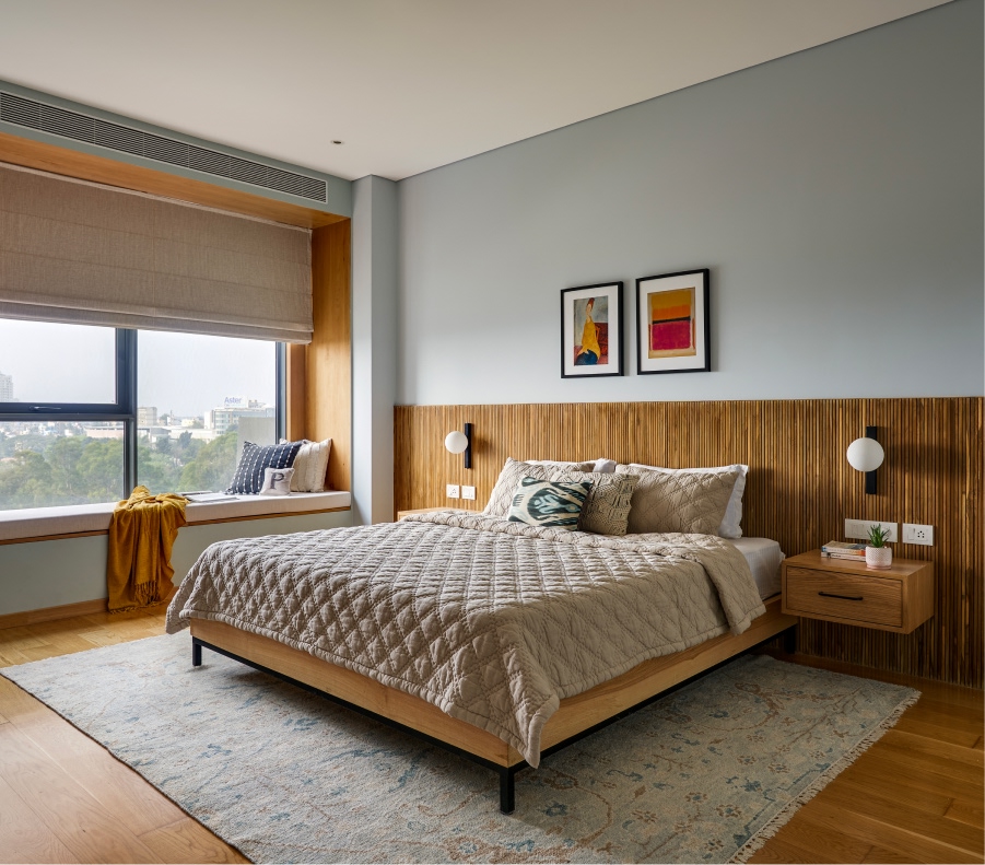 In the primary bedroom, the fluted headboard forms a tactile backdrop to the resting space with layered abstract art for company. The quaint window seat frames vignettes of the city below, posing as the idyllic perch for unwinding.