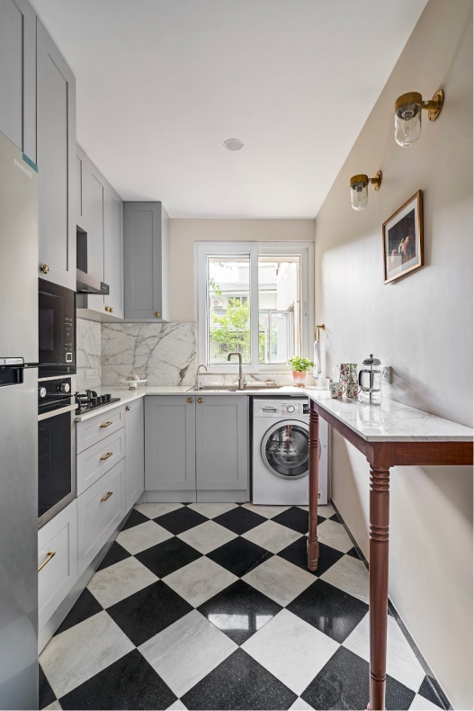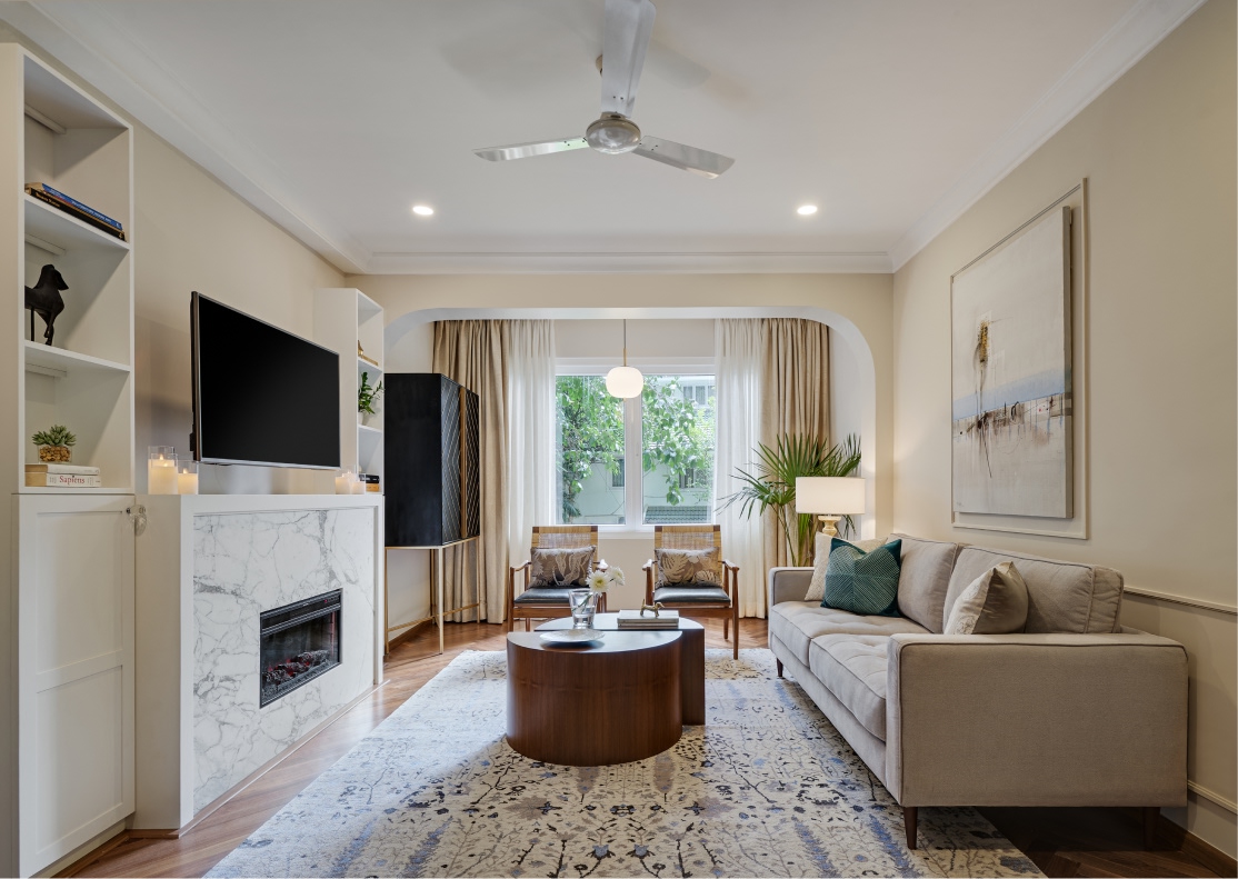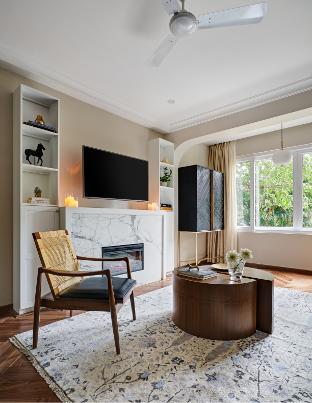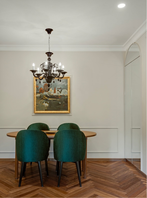 A marble-clad faux fireplace is the living’s visual epicentre, the conversation space scripted in a tufted grey sofa, cane-leather armchairs, and spilt coffee tables coming alive around the focal vignette. Under the artisanal glass chandelier’s glow, an oval table and emerald chairs form the dining space, flanked by a mirrored cabinet. A marble backsplash and soft grey cabinets grace the kitchen, and a marble-top work table introduces elevated function.
