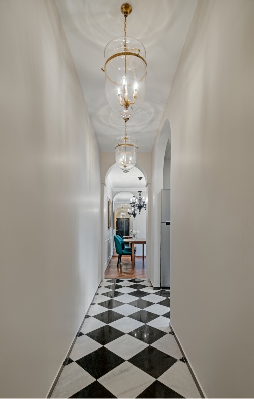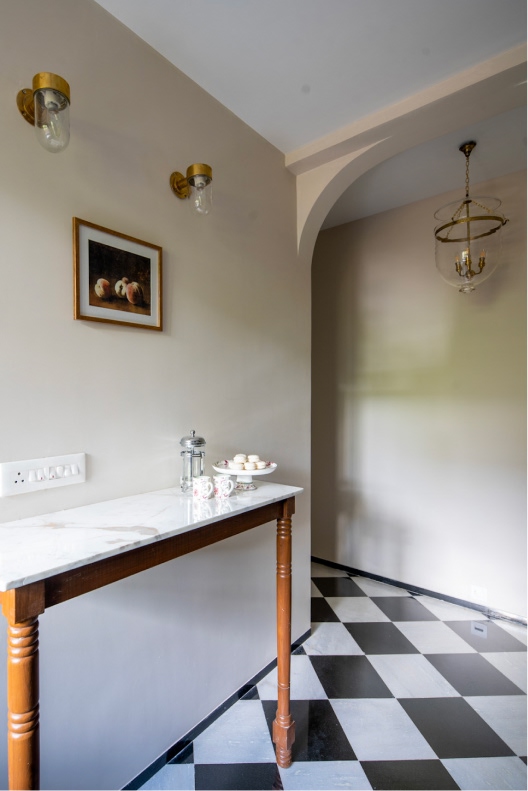 A gut renovation transforms the bones of this apartment in Old Bangalore’s heart into a Victorian townhouse with a modern pulse. The home’s narrow entry passage is steeped in drama, its length stamped by harlequin floors.