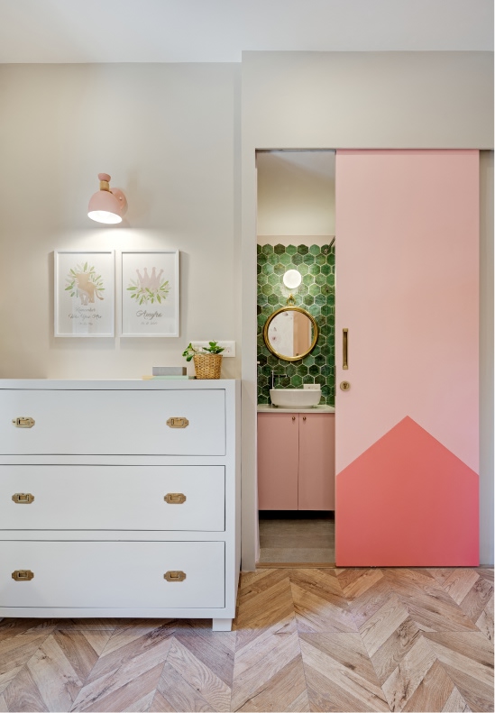 A scalloped blush headboard flanked by black nightstands defines the resting space in the master suite, with a partitioned walk‑in closet tucked neatly beside it. The master bath is white marble, finished with gold fixtures and a sleek vanity. The nursery is softened with a floral mural, a crib, and a pragmatic chest of drawers, while the bathroom surprises with green hex tiles and a two-toned door detail.