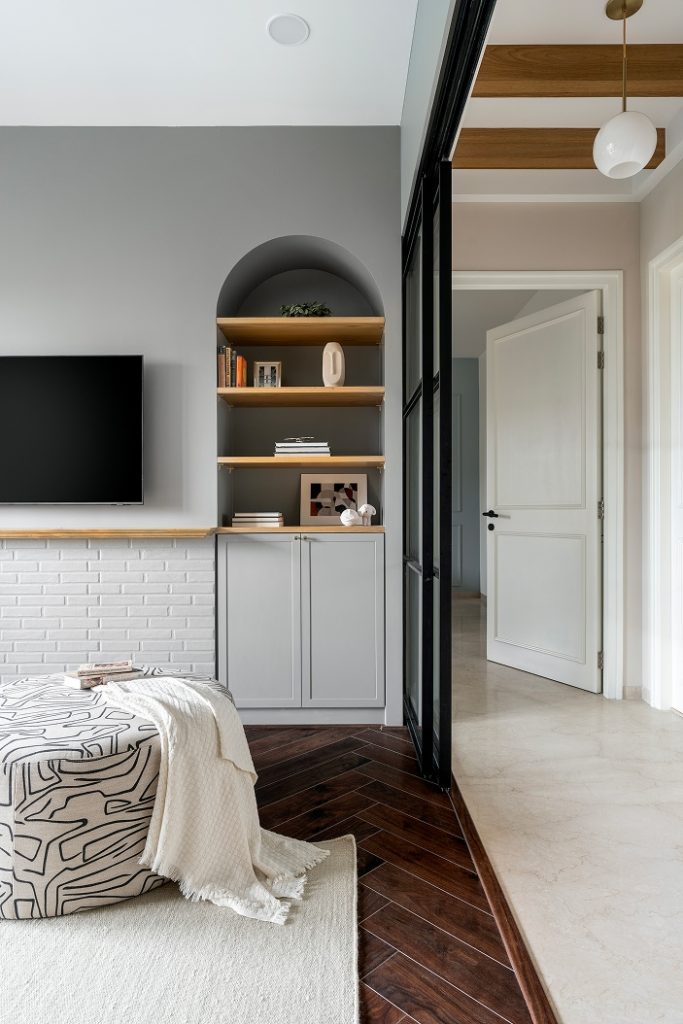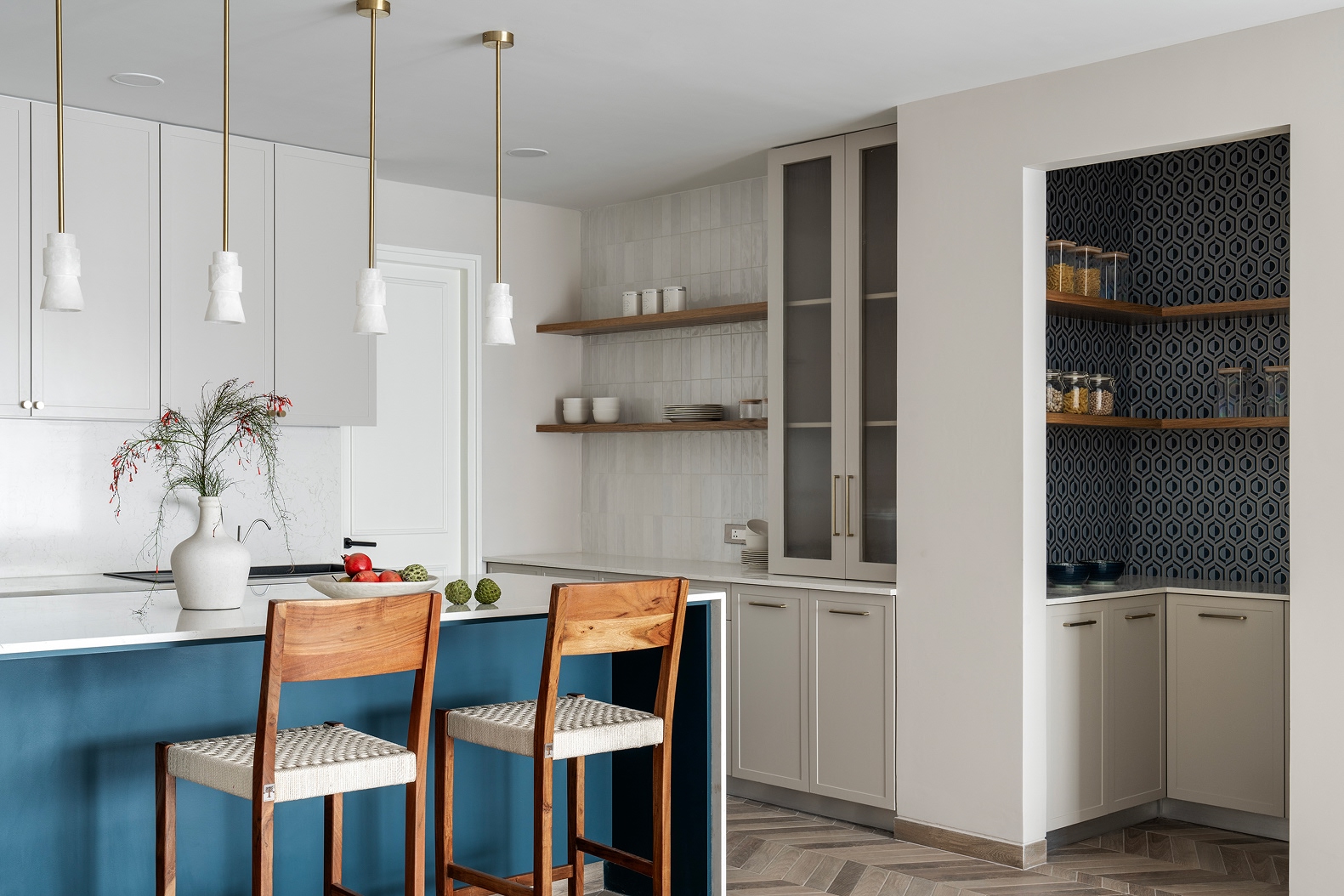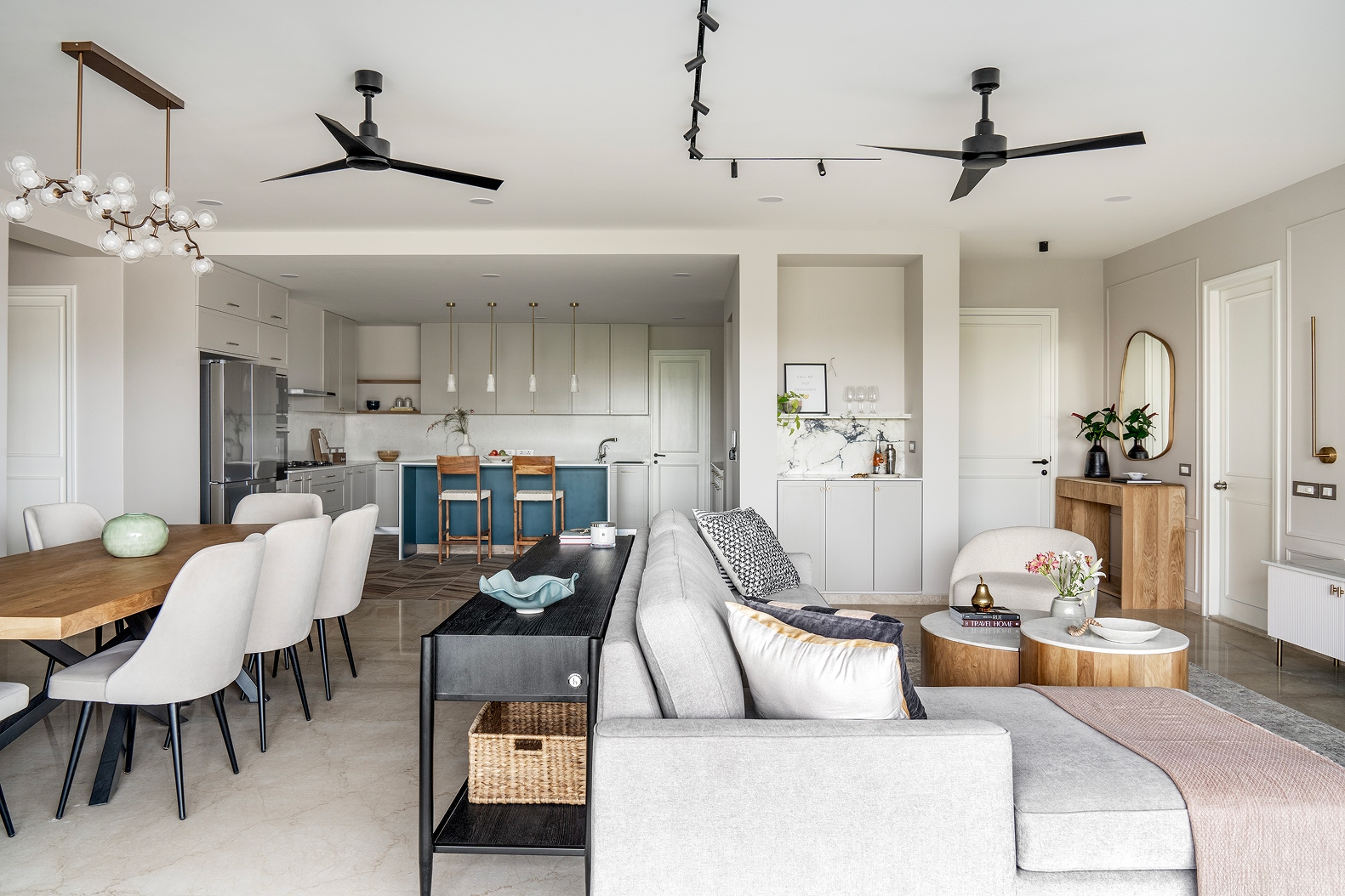 A medley of soft-toned hues traversing greys and blues sets the tone in the intimate spaces — an extension of the neutrality that flows uninterruptedly through the home. The residence’s reprised layout was thoughtfully designed to create distinct kitchen, living, and dining zones while fostering an openness that wasn’t a feature in the former blueprint.