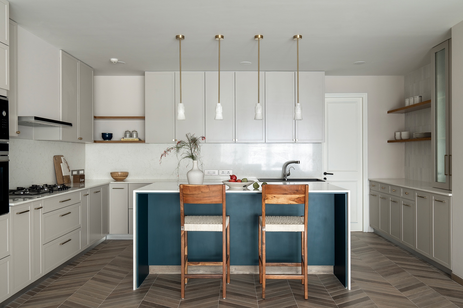 An open living cum dining space forms the home’s nucleus, its palette of hues and materiality striking a mindful balance between stated colours and subtle pattern play. The hearty kitchen becomes the family’s epicentre when they dine and host, its deep indigo island commanding attention at its centre.