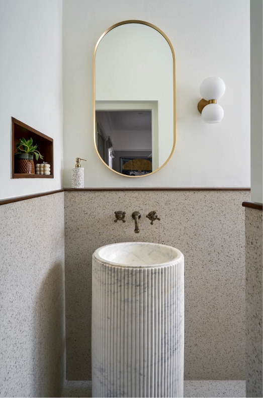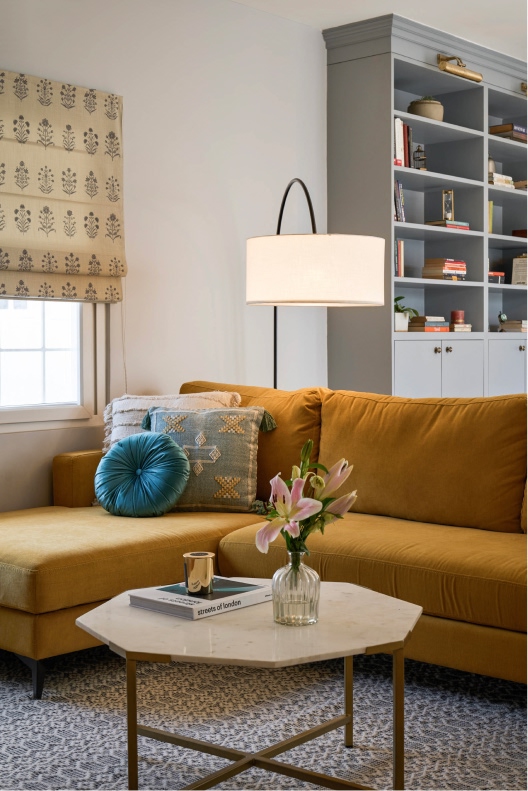 A sea of patterned tiles meets the enduring presence of grey-washed cabinets, with a mobile prep cart inhabiting the kitchen’s nucleus. The old and new converse in the dining area, with neutrals and wood creating an engaging ambience, and traditional Pichwai artwork gazing over the space.