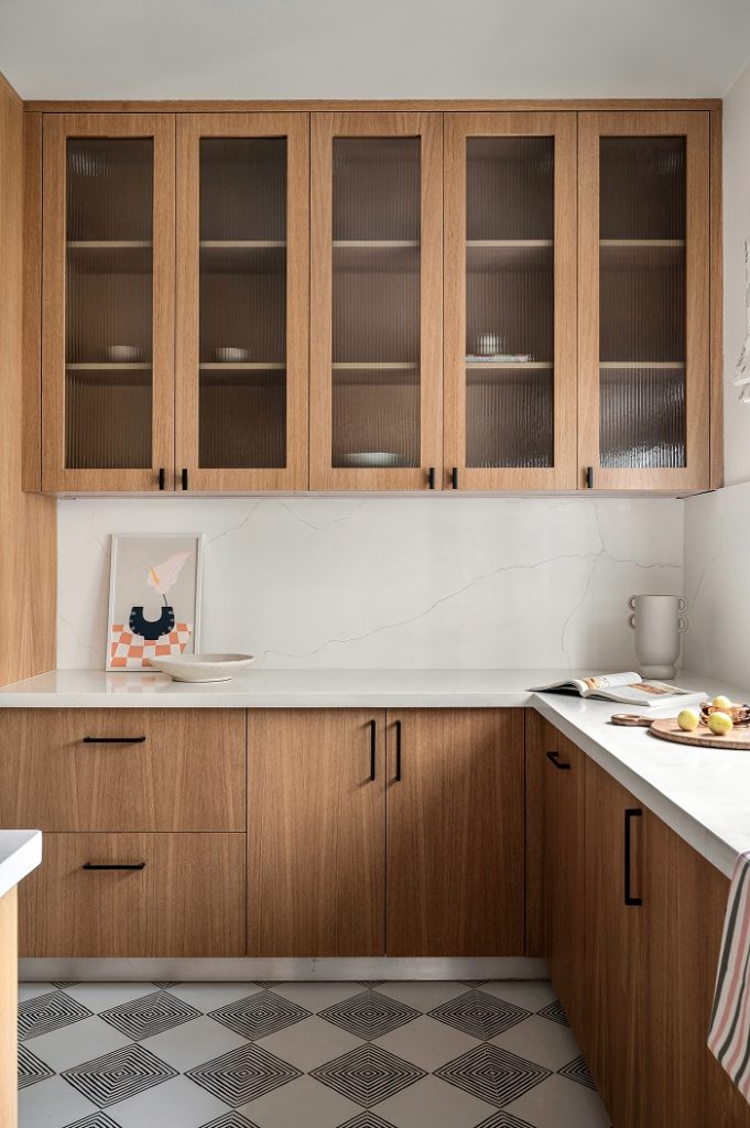A patterned variant of harlequin floors sheathes the kitchen’s extent, its sunny volume accented by walnut tones. Enwrapped in grasscloth wallpaper, the dining alcove is intimate and peers into the framed emerald tree canopies.