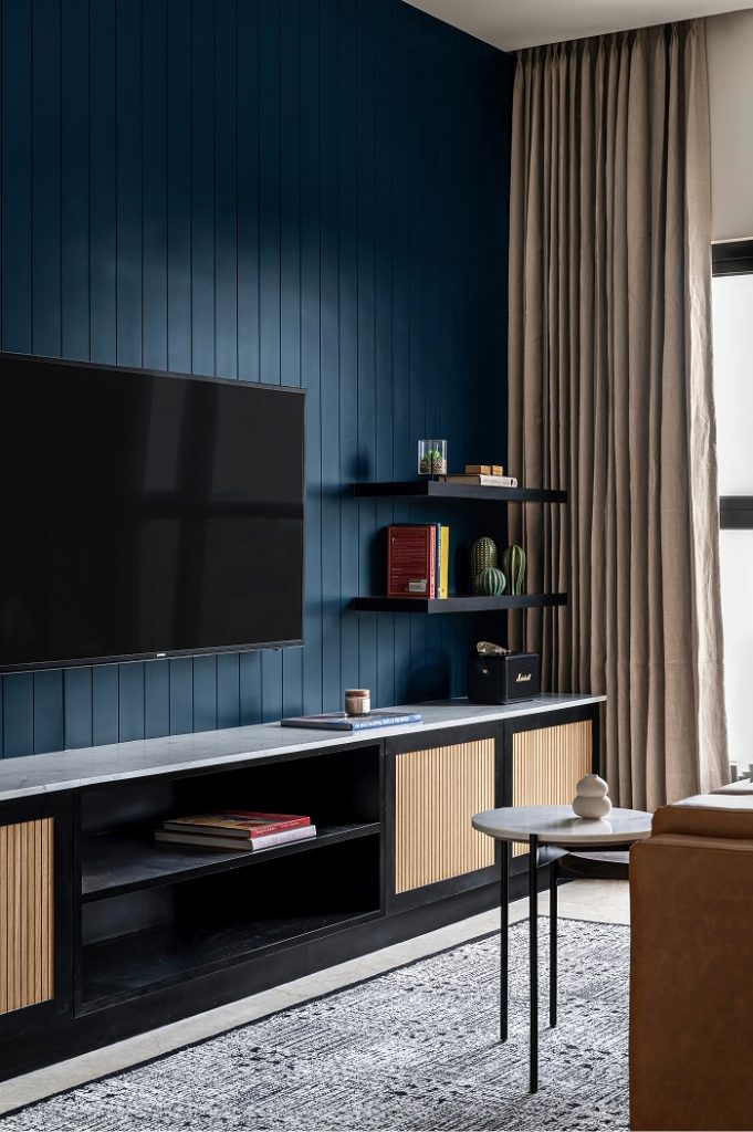 The muse of the living space is an art installation rich with a blend of deep navy, ochre, and green tones — the colours trickling into the room, which was designed in devotion to this statement addition.